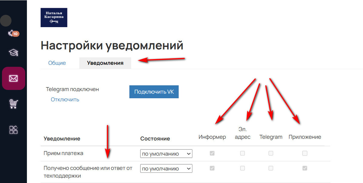 Если Вы выбираете/оставляете галочку на пункте информер, то входящие сообщения от нашей школы Вы будете получать только в личный кабинет на платформе GetCourse.